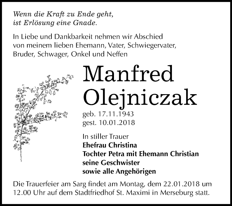 Hier finden Sie alle Traueranzeigen aus der Zeitung, die bisher für Manfred Olejniczak erschienen sind. Weitere Traueranzeigen, die in der Zeitung erscheinen, werden hier ebenfalls aufgelistet
