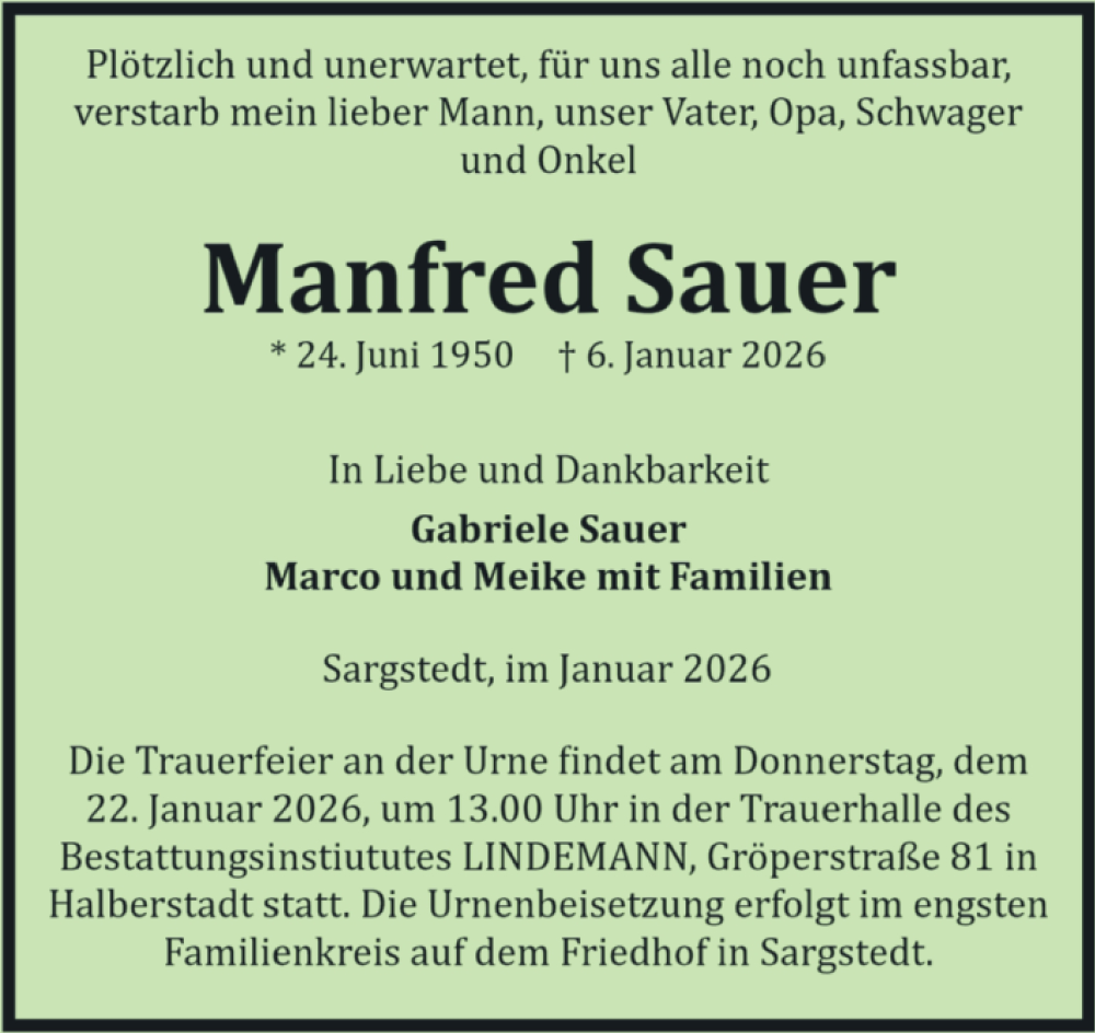Hier finden Sie alle Traueranzeigen aus der Zeitung, die bisher für Manfred Sauer erschienen sind. Weitere Traueranzeigen, die in der Zeitung erscheinen, werden hier ebenfalls aufgelistet