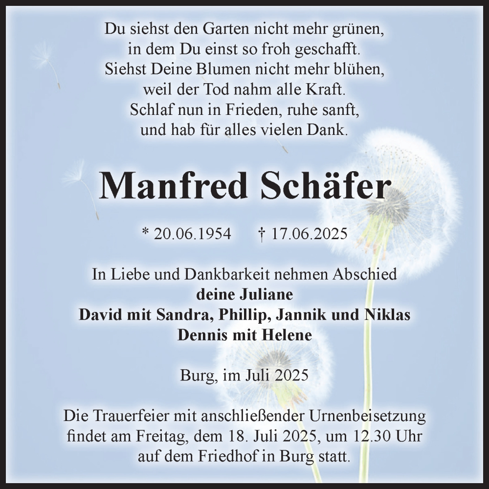 Hier finden Sie alle Traueranzeigen aus der Zeitung, die bisher für Manfred Schäfer erschienen sind. Weitere Traueranzeigen, die in der Zeitung erscheinen, werden hier ebenfalls aufgelistet