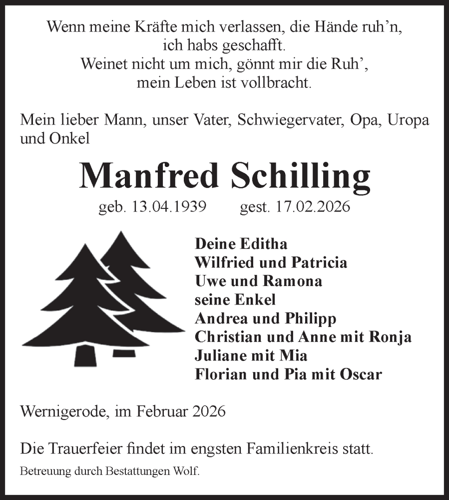 Hier finden Sie alle Traueranzeigen aus der Zeitung, die bisher für Manfred Schilling erschienen sind. Weitere Traueranzeigen, die in der Zeitung erscheinen, werden hier ebenfalls aufgelistet