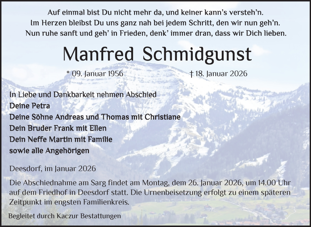 Hier finden Sie alle Traueranzeigen aus der Zeitung, die bisher für Manfred Schmidgunst erschienen sind. Weitere Traueranzeigen, die in der Zeitung erscheinen, werden hier ebenfalls aufgelistet