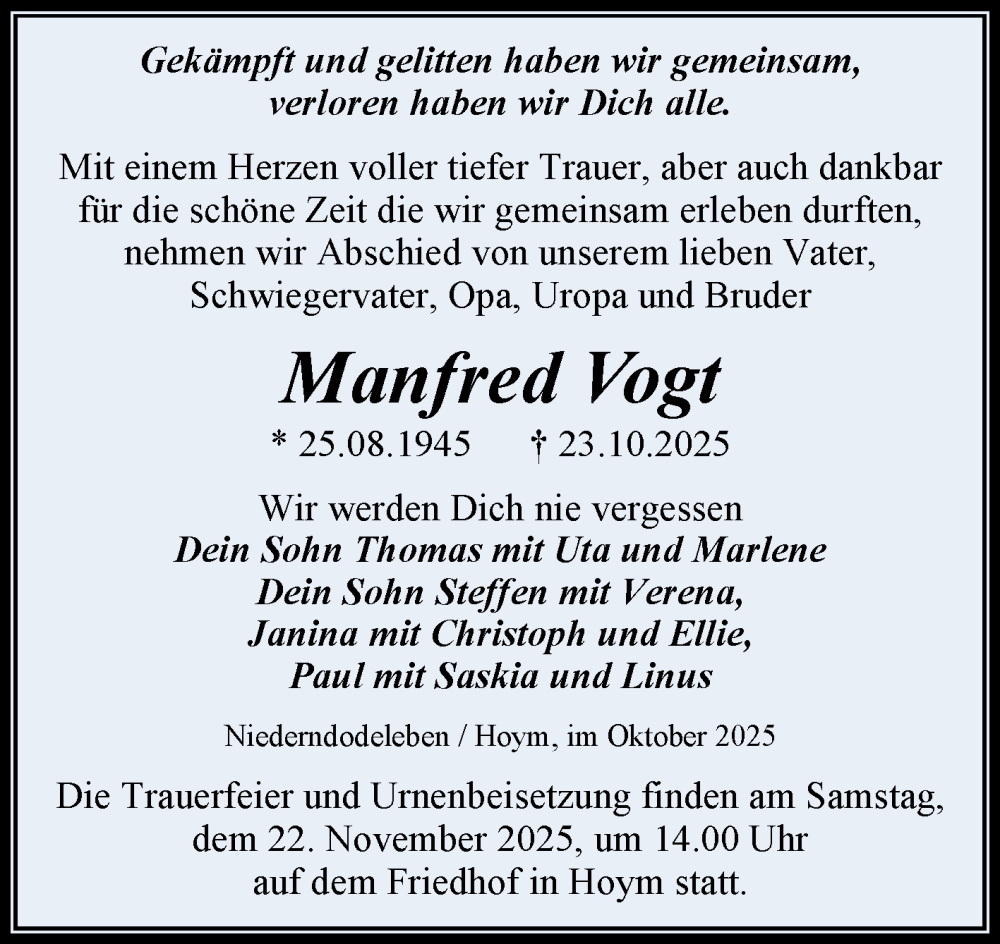 Hier finden Sie alle Traueranzeigen aus der Zeitung, die bisher für Manfred Vogt erschienen sind. Weitere Traueranzeigen, die in der Zeitung erscheinen, werden hier ebenfalls aufgelistet