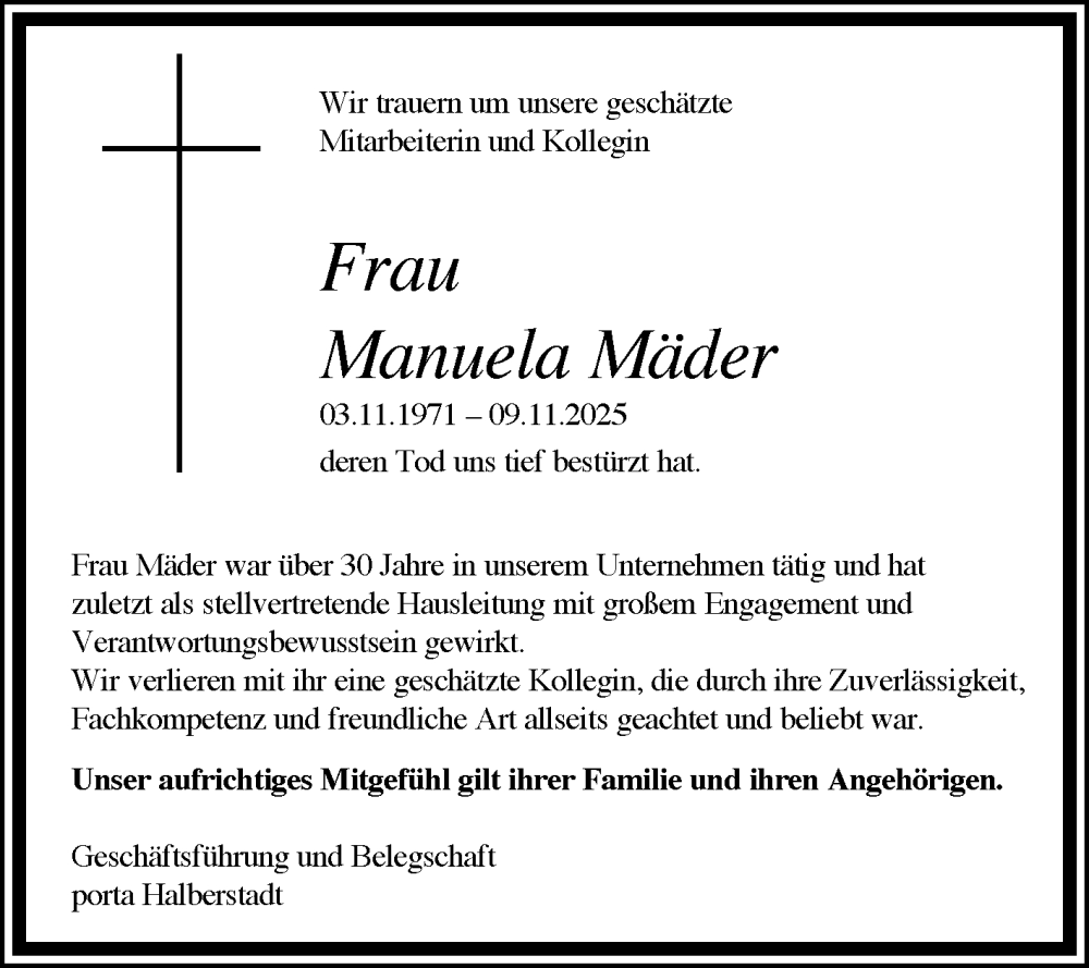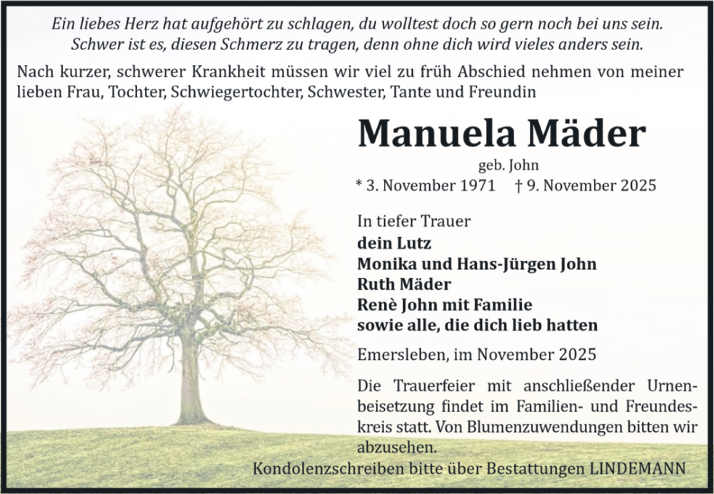 Hier finden Sie alle Traueranzeigen aus der Zeitung, die bisher für Manuela Mäder erschienen sind. Weitere Traueranzeigen, die in der Zeitung erscheinen, werden hier ebenfalls aufgelistet