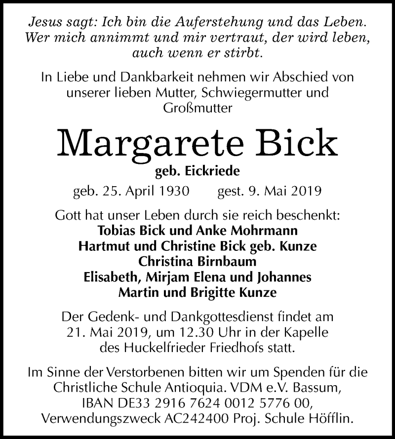Hier finden Sie alle Traueranzeigen aus der Zeitung, die bisher für Margarete Bick erschienen sind. Weitere Traueranzeigen, die in der Zeitung erscheinen, werden hier ebenfalls aufgelistet