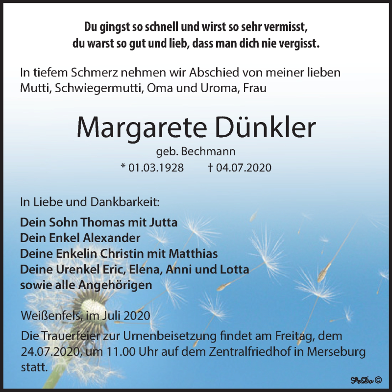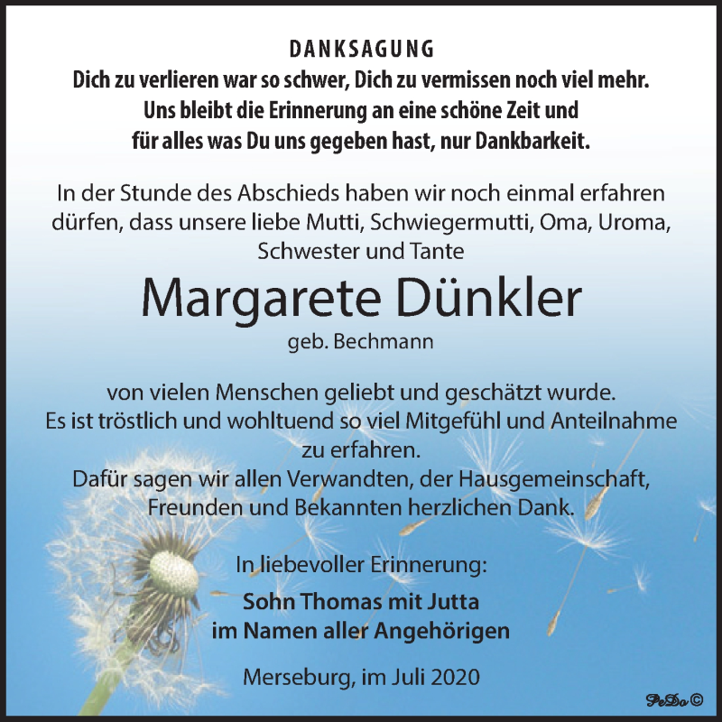 Hier finden Sie alle Traueranzeigen aus der Zeitung, die bisher für Margarete Dünkler erschienen sind. Weitere Traueranzeigen, die in der Zeitung erscheinen, werden hier ebenfalls aufgelistet