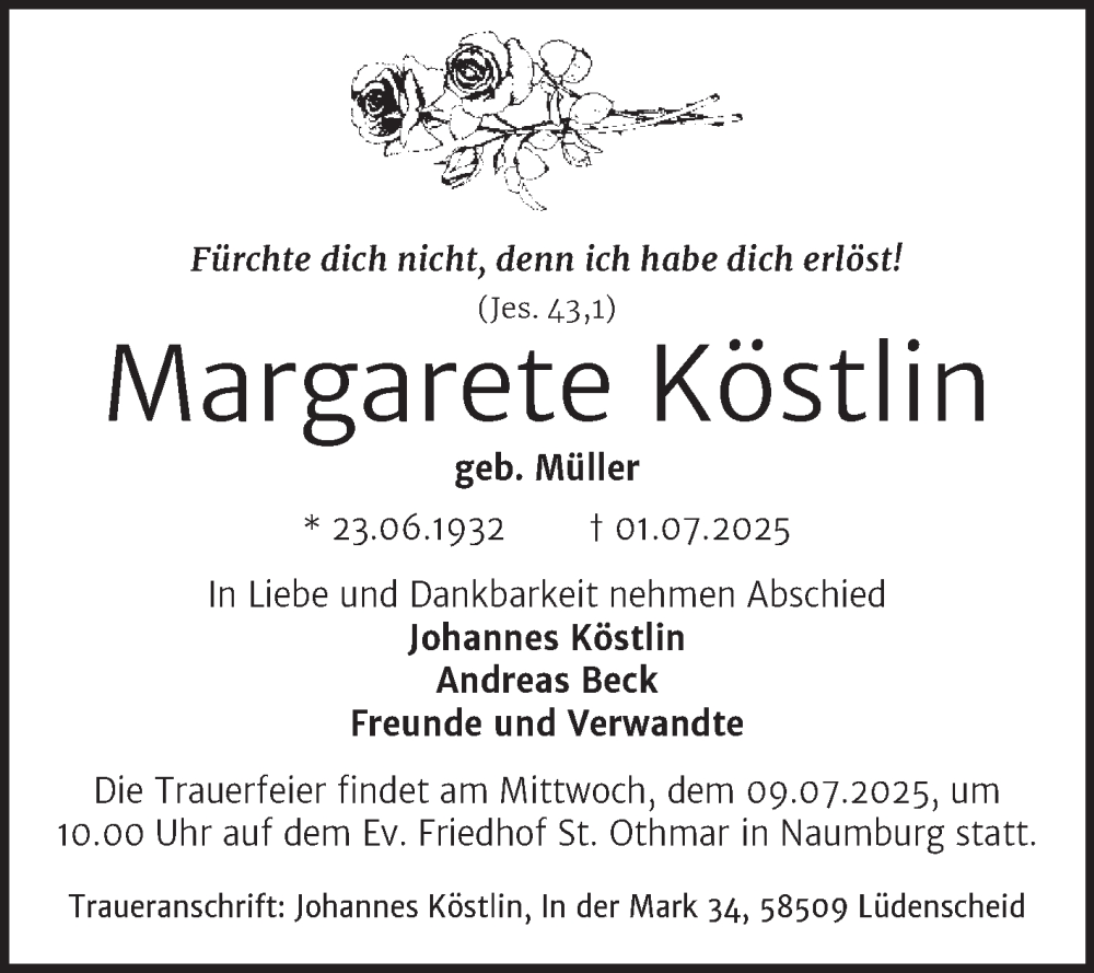 Hier finden Sie alle Traueranzeigen aus der Zeitung, die bisher für Margarete Köstlin erschienen sind. Weitere Traueranzeigen, die in der Zeitung erscheinen, werden hier ebenfalls aufgelistet