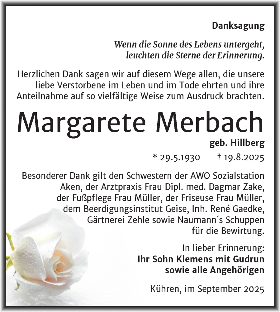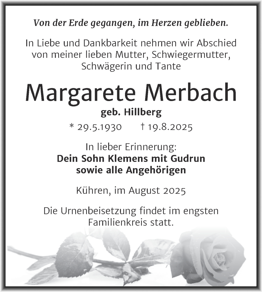 Hier finden Sie alle Traueranzeigen aus der Zeitung, die bisher für Margarete Merbach erschienen sind. Weitere Traueranzeigen, die in der Zeitung erscheinen, werden hier ebenfalls aufgelistet