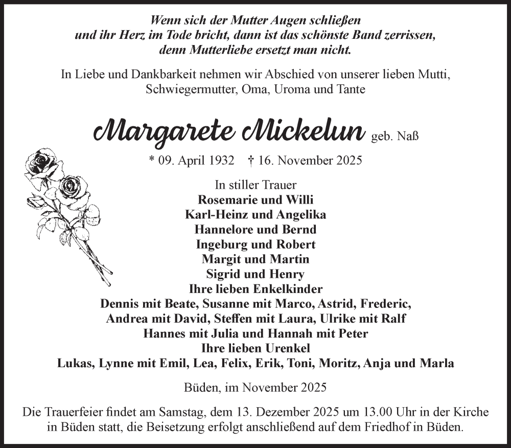 Hier finden Sie alle Traueranzeigen aus der Zeitung, die bisher für Margarete Mickelun erschienen sind. Weitere Traueranzeigen, die in der Zeitung erscheinen, werden hier ebenfalls aufgelistet