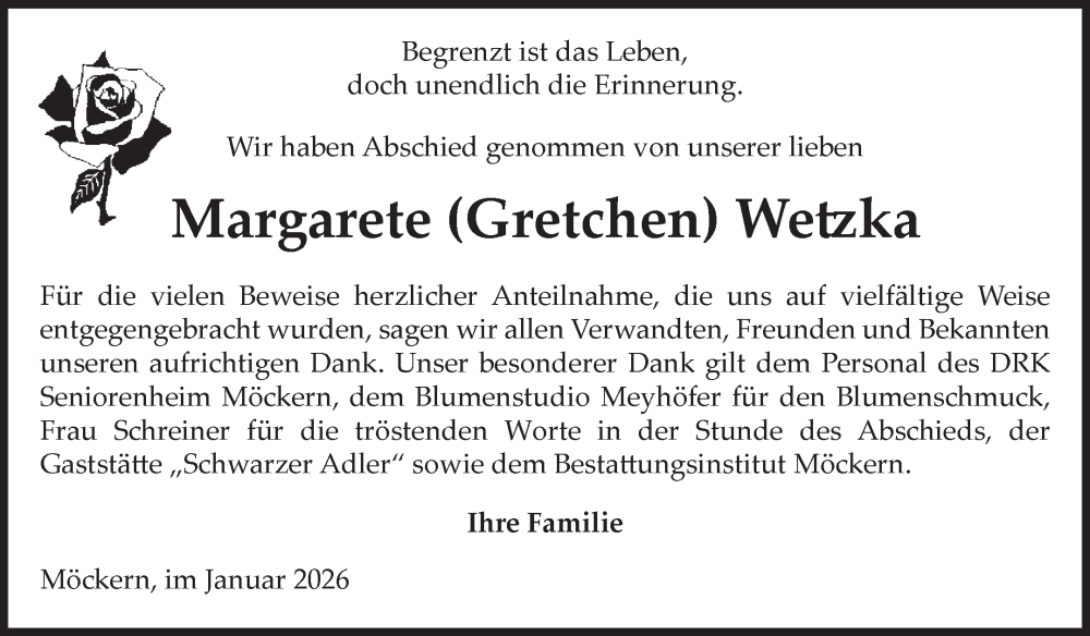 Hier finden Sie alle Traueranzeigen aus der Zeitung, die bisher für Margarete Wetzka erschienen sind. Weitere Traueranzeigen, die in der Zeitung erscheinen, werden hier ebenfalls aufgelistet