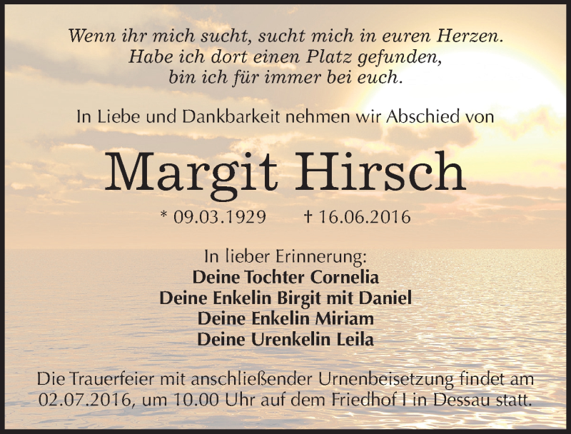 Hier finden Sie alle Traueranzeigen aus der Zeitung, die bisher für Margit Hirsch erschienen sind. Weitere Traueranzeigen, die in der Zeitung erscheinen, werden hier ebenfalls aufgelistet