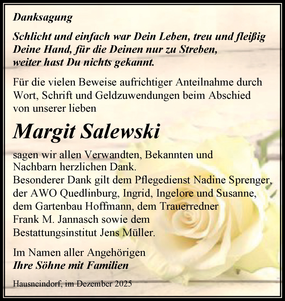 Hier finden Sie alle Traueranzeigen aus der Zeitung, die bisher für Margit Salewski erschienen sind. Weitere Traueranzeigen, die in der Zeitung erscheinen, werden hier ebenfalls aufgelistet