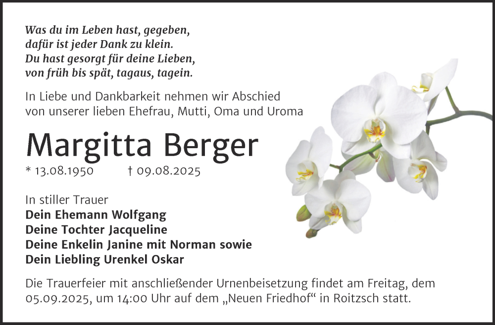 Hier finden Sie alle Traueranzeigen aus der Zeitung, die bisher für Margitta Berger erschienen sind. Weitere Traueranzeigen, die in der Zeitung erscheinen, werden hier ebenfalls aufgelistet