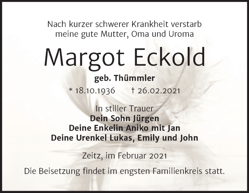 Hier finden Sie alle Traueranzeigen aus der Zeitung, die bisher für Margot Eckold erschienen sind. Weitere Traueranzeigen, die in der Zeitung erscheinen, werden hier ebenfalls aufgelistet