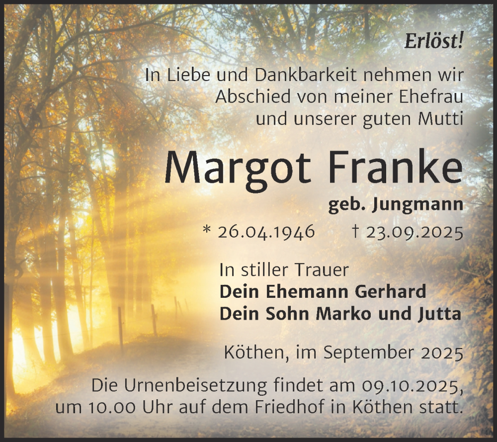 Hier finden Sie alle Traueranzeigen aus der Zeitung, die bisher für Margot Franke erschienen sind. Weitere Traueranzeigen, die in der Zeitung erscheinen, werden hier ebenfalls aufgelistet