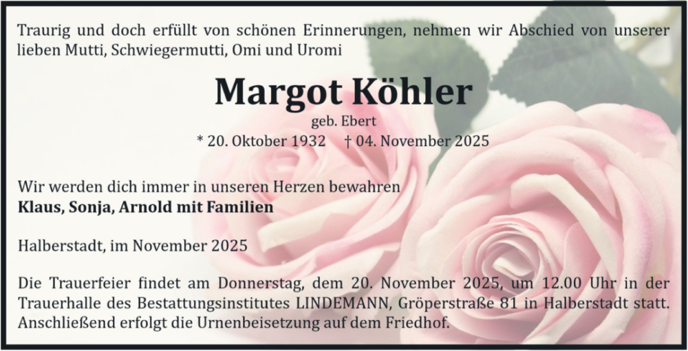 Hier finden Sie alle Traueranzeigen aus der Zeitung, die bisher für Margot Köhler erschienen sind. Weitere Traueranzeigen, die in der Zeitung erscheinen, werden hier ebenfalls aufgelistet