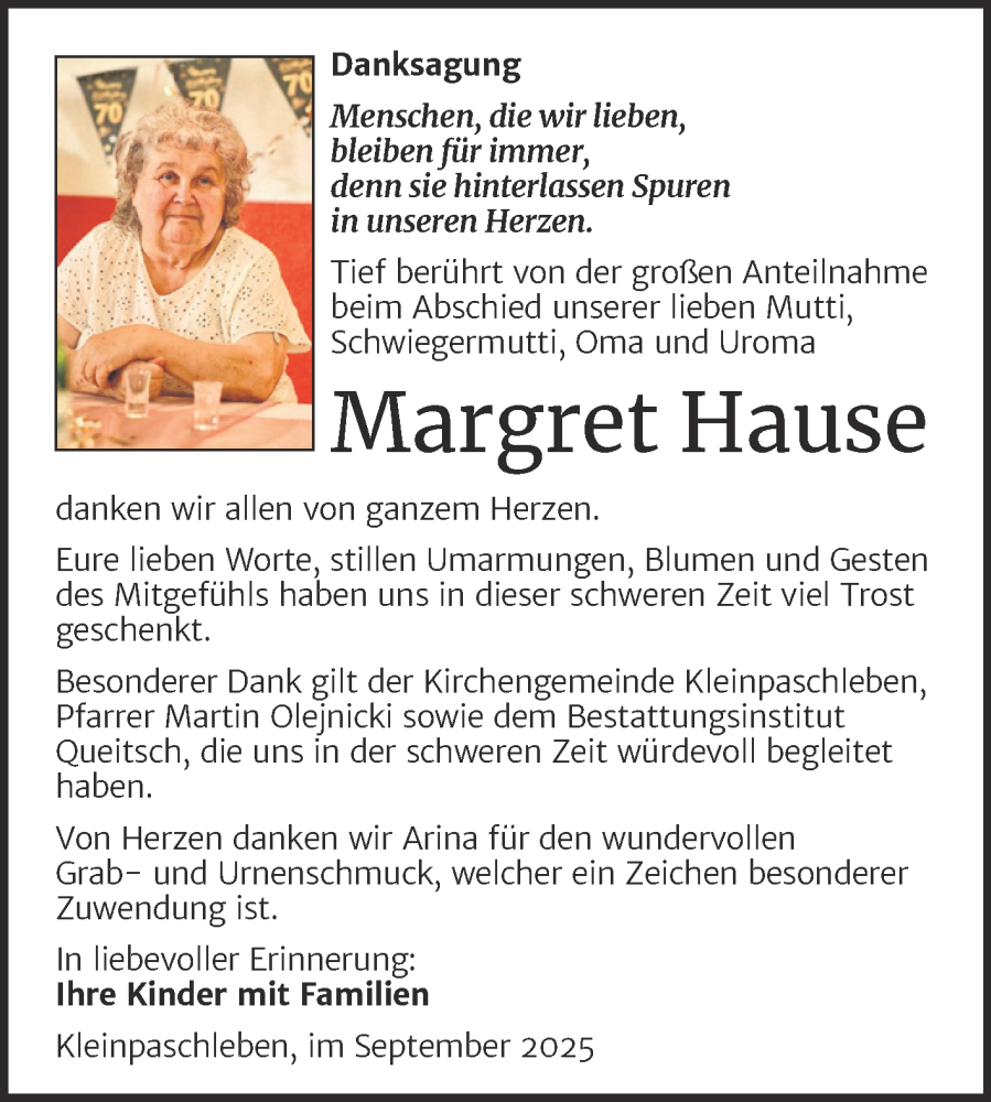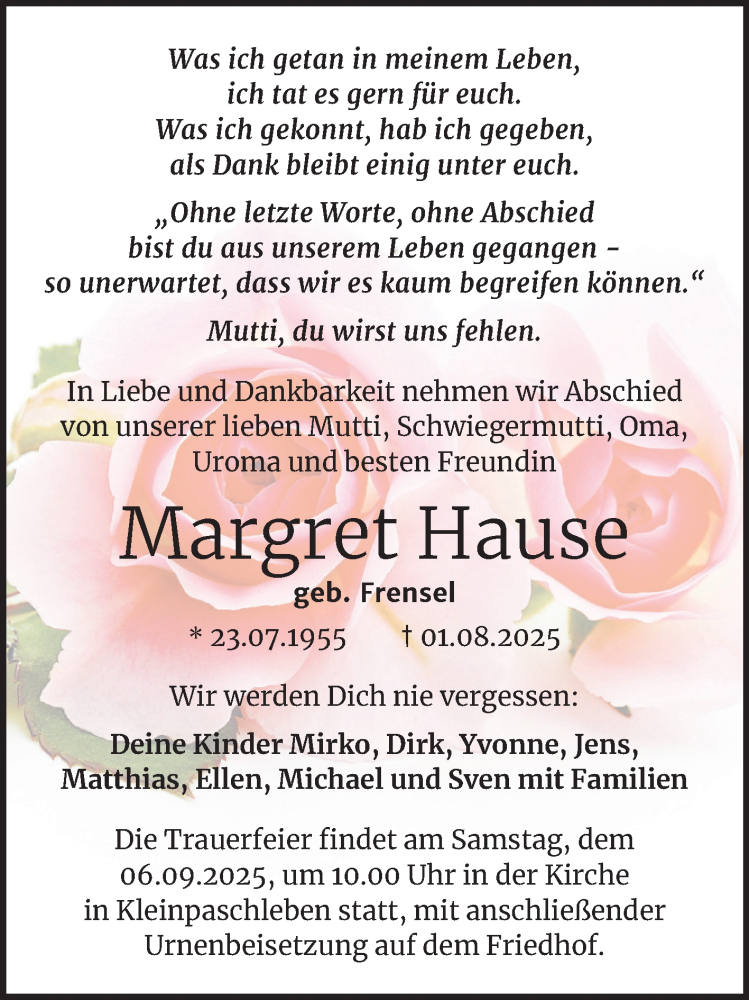 Hier finden Sie alle Traueranzeigen aus der Zeitung, die bisher für Margret Hause erschienen sind. Weitere Traueranzeigen, die in der Zeitung erscheinen, werden hier ebenfalls aufgelistet