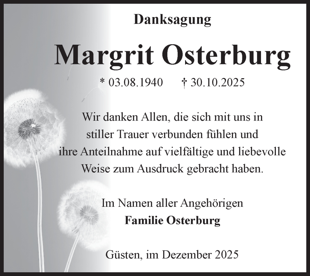 Hier finden Sie alle Traueranzeigen aus der Zeitung, die bisher für Margrit Osterburg erschienen sind. Weitere Traueranzeigen, die in der Zeitung erscheinen, werden hier ebenfalls aufgelistet