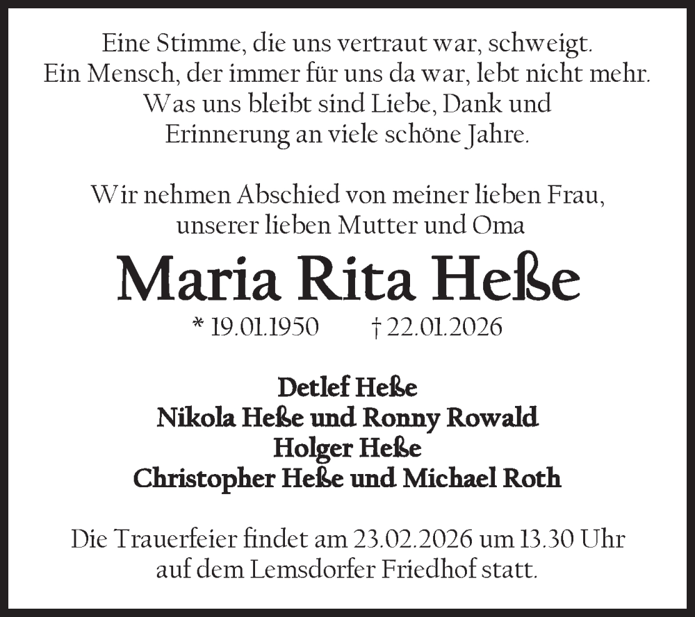 Hier finden Sie alle Traueranzeigen aus der Zeitung, die bisher für Maria Rita Heße erschienen sind. Weitere Traueranzeigen, die in der Zeitung erscheinen, werden hier ebenfalls aufgelistet