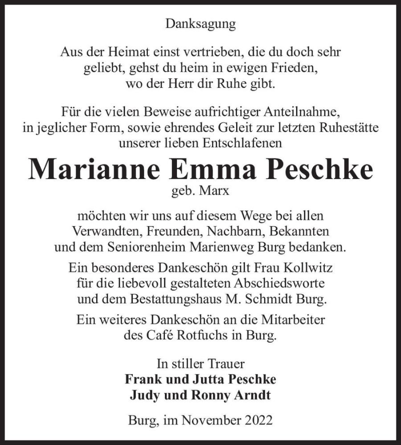 Hier finden Sie alle Traueranzeigen aus der Zeitung, die bisher für Marianne Emma Peschke (geb. Marx) erschienen sind. Weitere Traueranzeigen, die in der Zeitung erscheinen, werden hier ebenfalls aufgelistet