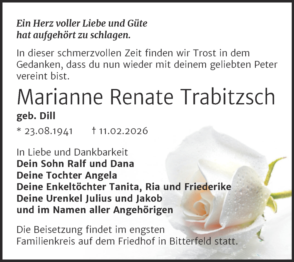 Hier finden Sie alle Traueranzeigen aus der Zeitung, die bisher für Marianne Renate Trabitzsch erschienen sind. Weitere Traueranzeigen, die in der Zeitung erscheinen, werden hier ebenfalls aufgelistet