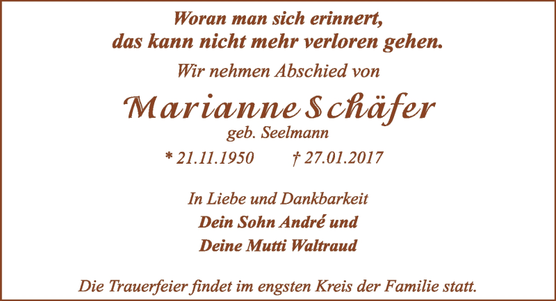 Hier finden Sie alle Traueranzeigen aus der Zeitung, die bisher für Marianne Schäfer erschienen sind. Weitere Traueranzeigen, die in der Zeitung erscheinen, werden hier ebenfalls aufgelistet
