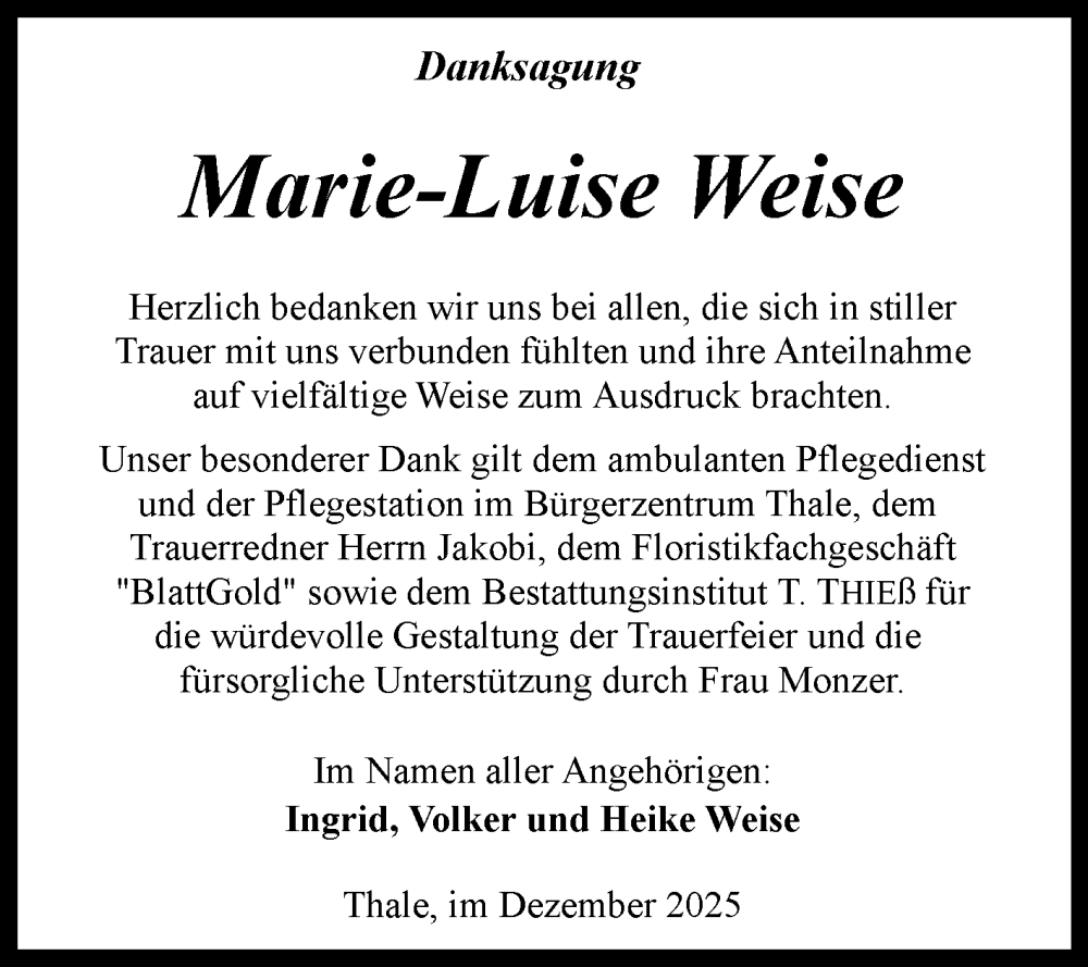 Hier finden Sie alle Traueranzeigen aus der Zeitung, die bisher für Marie-Luise Weise erschienen sind. Weitere Traueranzeigen, die in der Zeitung erscheinen, werden hier ebenfalls aufgelistet