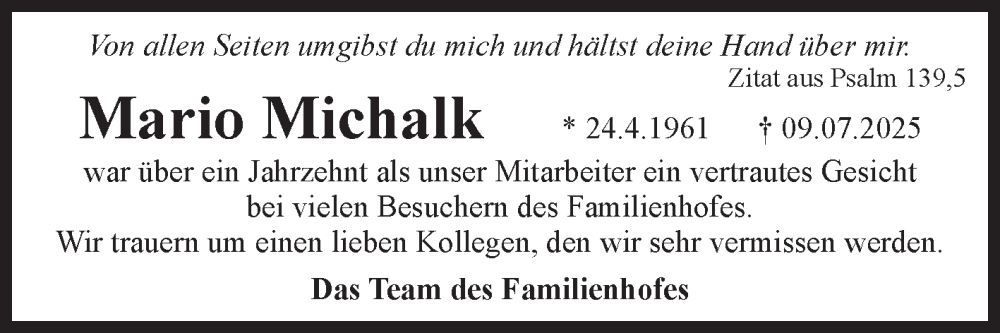 Hier finden Sie alle Traueranzeigen aus der Zeitung, die bisher für Mario Michalk erschienen sind. Weitere Traueranzeigen, die in der Zeitung erscheinen, werden hier ebenfalls aufgelistet
