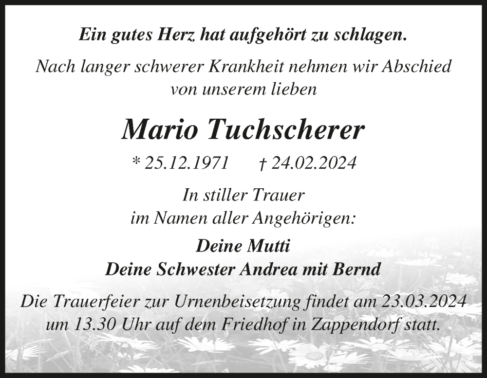 Hier finden Sie alle Traueranzeigen aus der Zeitung, die bisher für Mario Tuchscherer erschienen sind. Weitere Traueranzeigen, die in der Zeitung erscheinen, werden hier ebenfalls aufgelistet