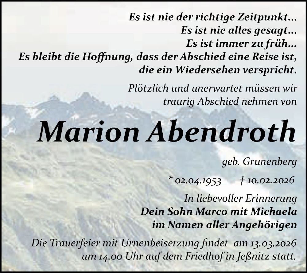 Hier finden Sie alle Traueranzeigen aus der Zeitung, die bisher für Marion Abendroth erschienen sind. Weitere Traueranzeigen, die in der Zeitung erscheinen, werden hier ebenfalls aufgelistet