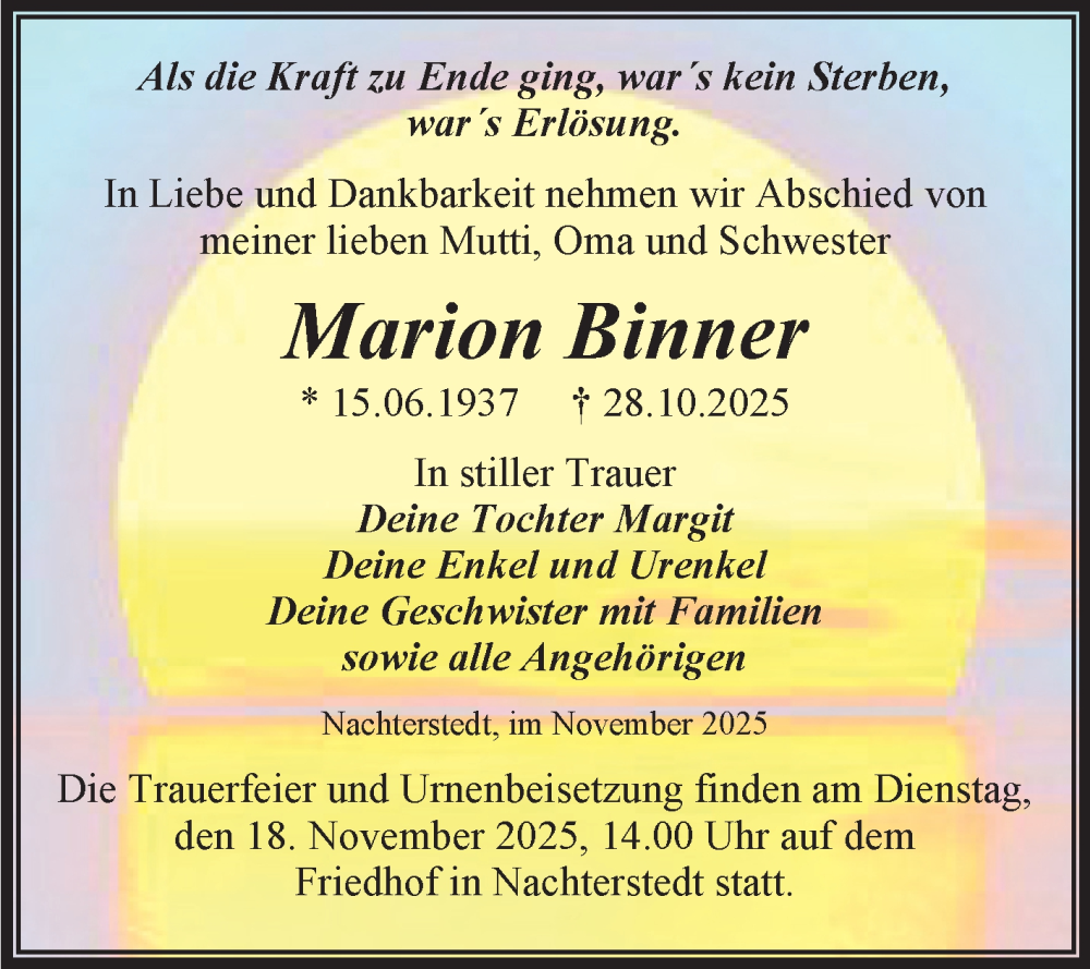 Hier finden Sie alle Traueranzeigen aus der Zeitung, die bisher für Marion Binner erschienen sind. Weitere Traueranzeigen, die in der Zeitung erscheinen, werden hier ebenfalls aufgelistet