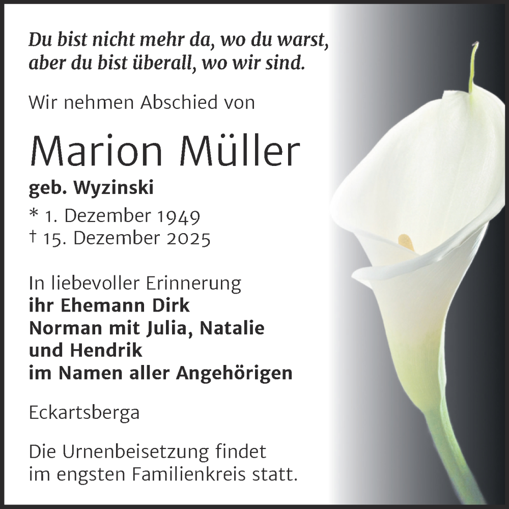 Hier finden Sie alle Traueranzeigen aus der Zeitung, die bisher für Marion Müller erschienen sind. Weitere Traueranzeigen, die in der Zeitung erscheinen, werden hier ebenfalls aufgelistet