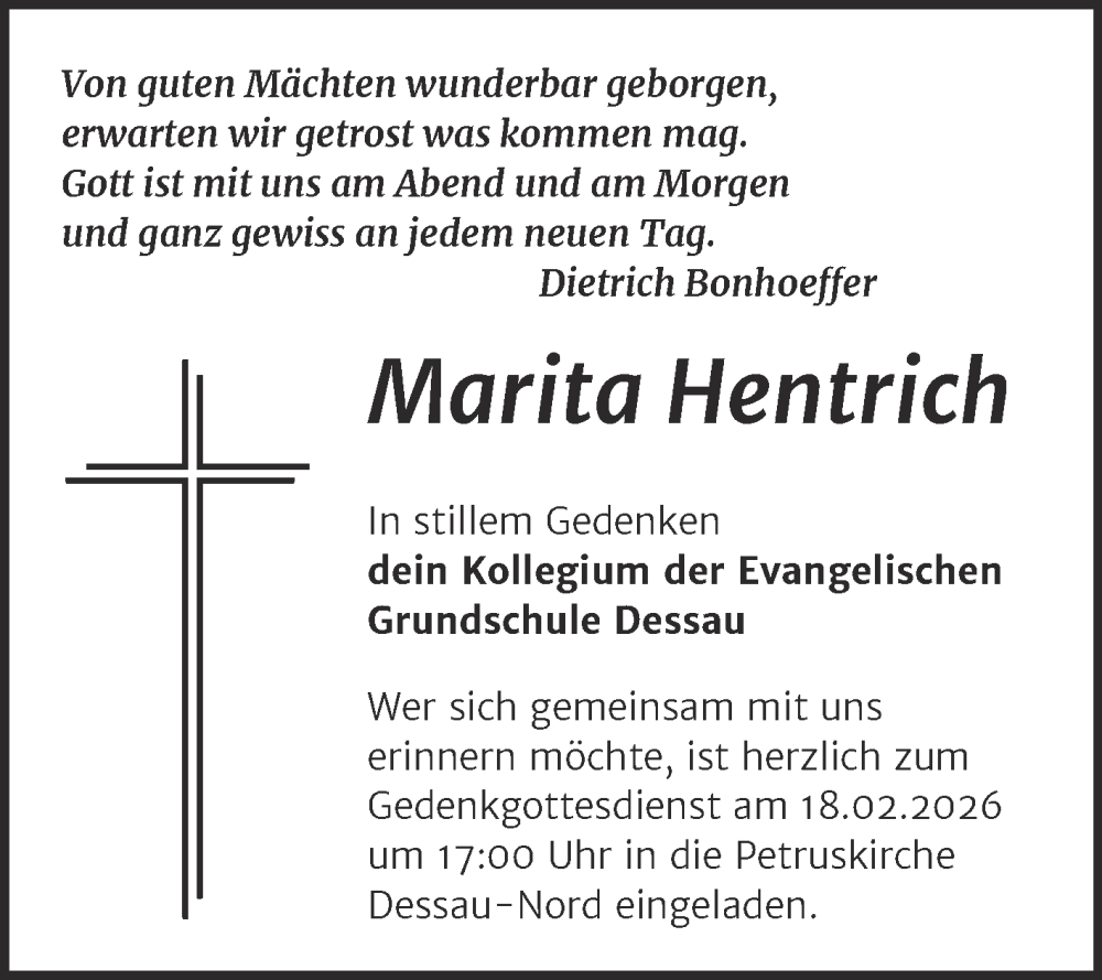 Hier finden Sie alle Traueranzeigen aus der Zeitung, die bisher für Marita Hentrich erschienen sind. Weitere Traueranzeigen, die in der Zeitung erscheinen, werden hier ebenfalls aufgelistet