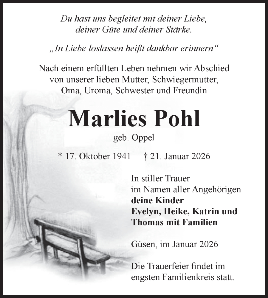 Hier finden Sie alle Traueranzeigen aus der Zeitung, die bisher für Marlies Pohl erschienen sind. Weitere Traueranzeigen, die in der Zeitung erscheinen, werden hier ebenfalls aufgelistet