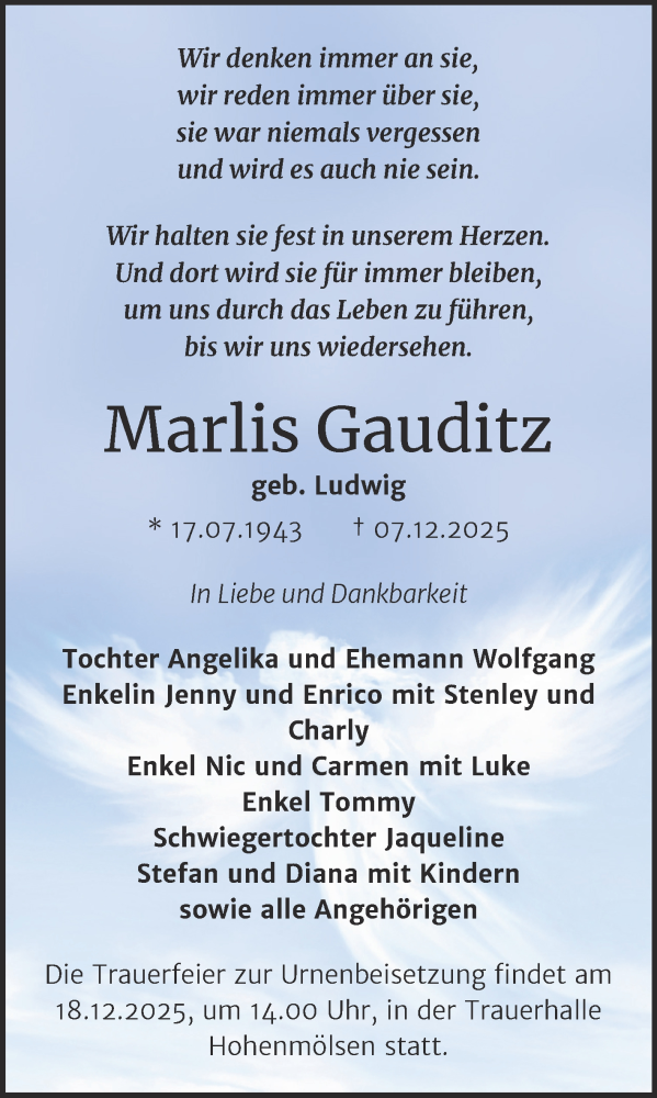Hier finden Sie alle Traueranzeigen aus der Zeitung, die bisher für Marlis Gauditz erschienen sind. Weitere Traueranzeigen, die in der Zeitung erscheinen, werden hier ebenfalls aufgelistet