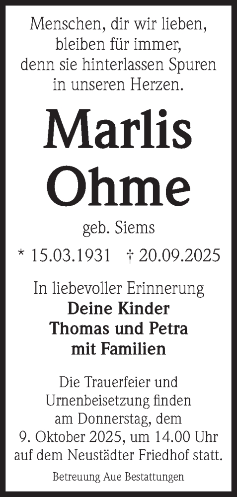 Hier finden Sie alle Traueranzeigen aus der Zeitung, die bisher für Marlis Ohme erschienen sind. Weitere Traueranzeigen, die in der Zeitung erscheinen, werden hier ebenfalls aufgelistet