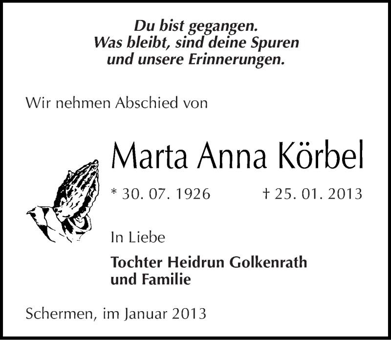 Hier finden Sie alle Traueranzeigen aus der Zeitung, die bisher für Marta Anna Körbel erschienen sind. Weitere Traueranzeigen, die in der Zeitung erscheinen, werden hier ebenfalls aufgelistet