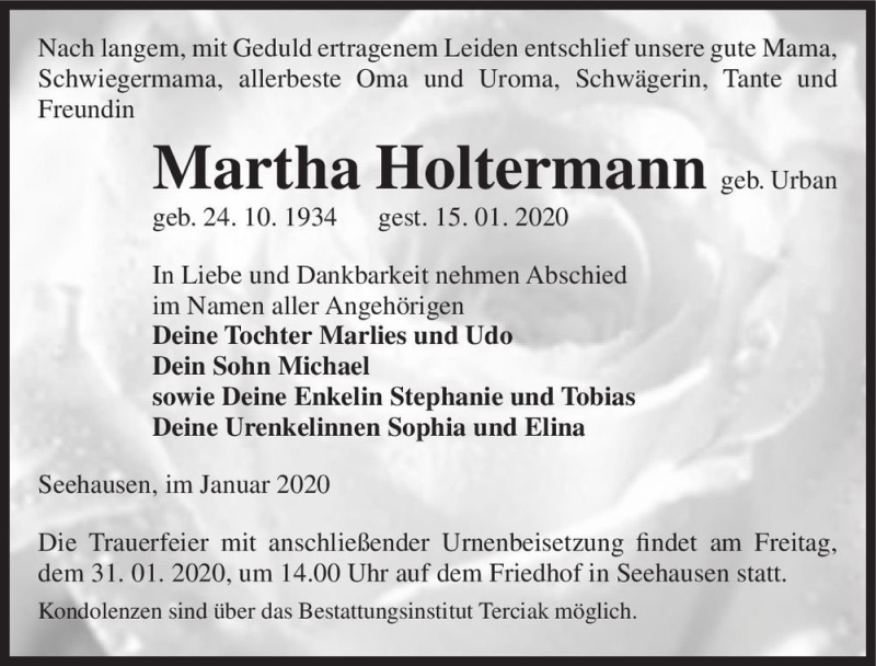 Hier finden Sie alle Traueranzeigen aus der Zeitung, die bisher für Martha Holtermann (geb. Urban) erschienen sind. Weitere Traueranzeigen, die in der Zeitung erscheinen, werden hier ebenfalls aufgelistet