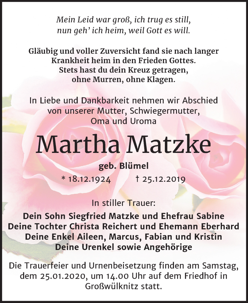 Hier finden Sie alle Traueranzeigen aus der Zeitung, die bisher für Martha Matzke erschienen sind. Weitere Traueranzeigen, die in der Zeitung erscheinen, werden hier ebenfalls aufgelistet
