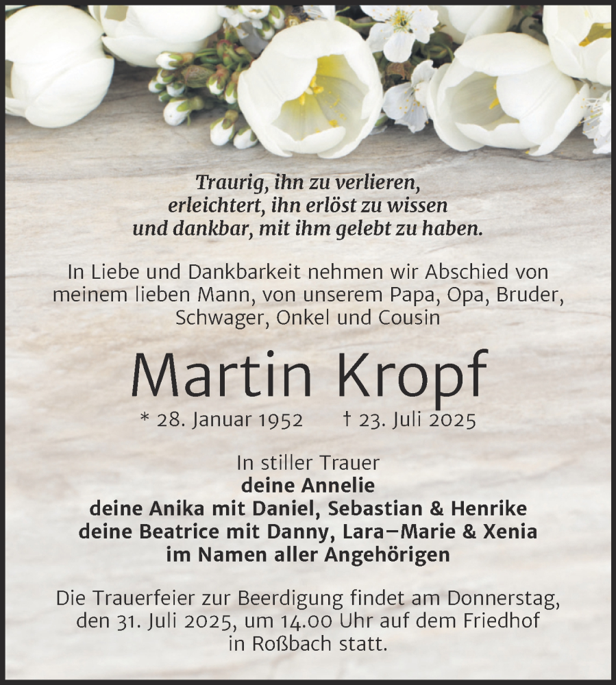 Hier finden Sie alle Traueranzeigen aus der Zeitung, die bisher für Martin Kropf erschienen sind. Weitere Traueranzeigen, die in der Zeitung erscheinen, werden hier ebenfalls aufgelistet