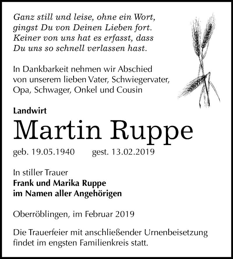 Hier finden Sie alle Traueranzeigen aus der Zeitung, die bisher für Martin Ruppe erschienen sind. Weitere Traueranzeigen, die in der Zeitung erscheinen, werden hier ebenfalls aufgelistet