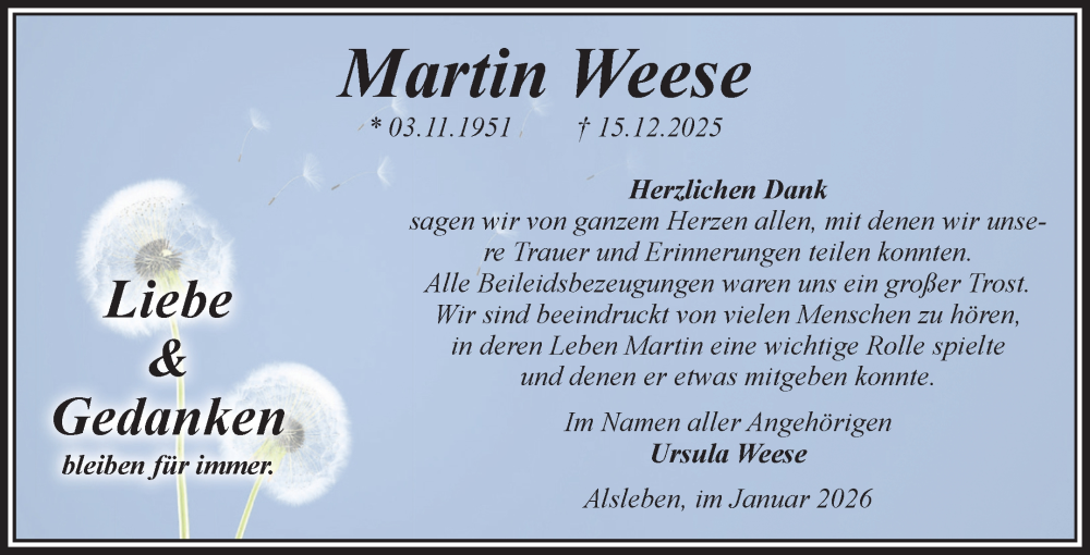 Hier finden Sie alle Traueranzeigen aus der Zeitung, die bisher für Martin Weese erschienen sind. Weitere Traueranzeigen, die in der Zeitung erscheinen, werden hier ebenfalls aufgelistet