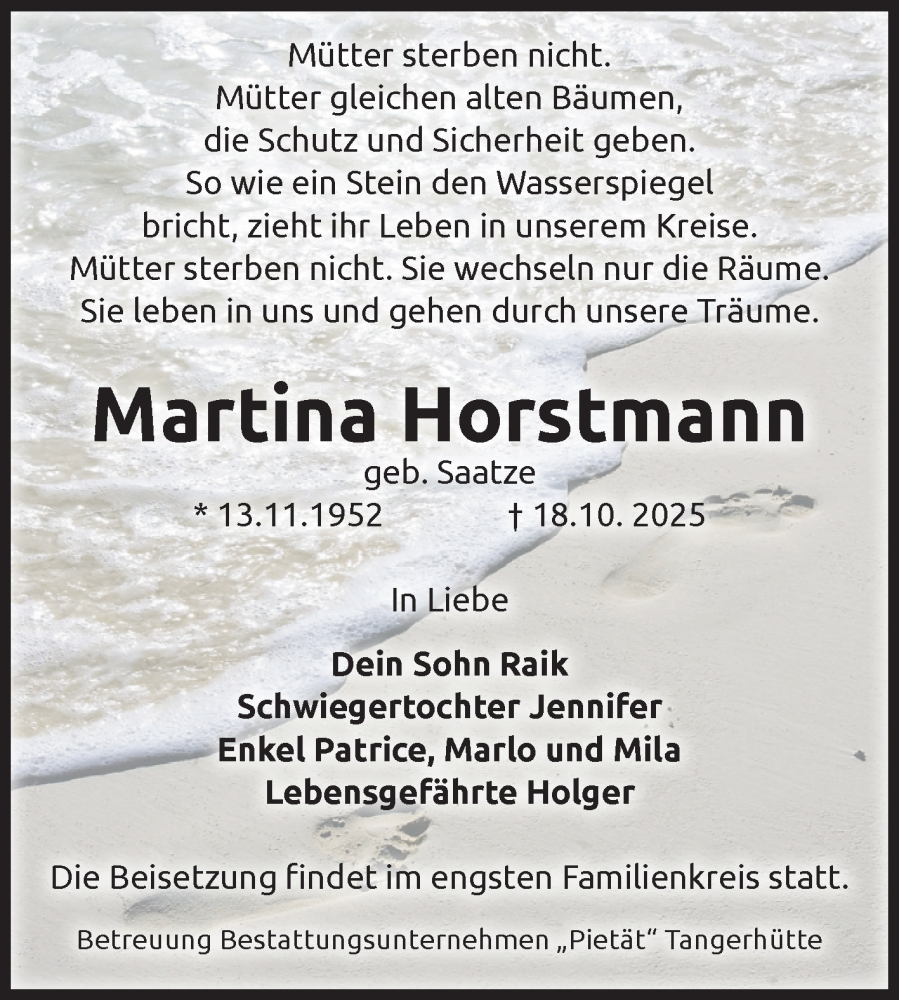 Hier finden Sie alle Traueranzeigen aus der Zeitung, die bisher für Martina Horstmann erschienen sind. Weitere Traueranzeigen, die in der Zeitung erscheinen, werden hier ebenfalls aufgelistet