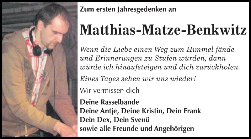 Hier finden Sie alle Traueranzeigen aus der Zeitung, die bisher für Matthias Benkwitz erschienen sind. Weitere Traueranzeigen, die in der Zeitung erscheinen, werden hier ebenfalls aufgelistet