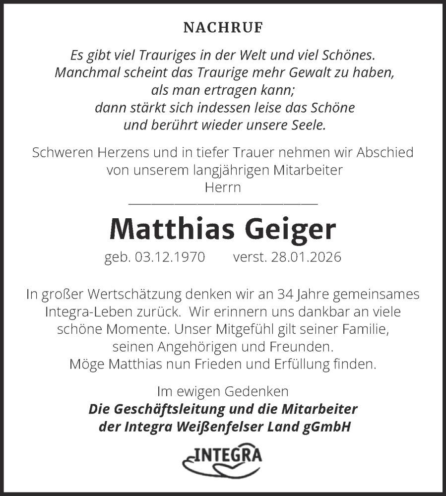 Hier finden Sie alle Traueranzeigen aus der Zeitung, die bisher für Matthias Geiger erschienen sind. Weitere Traueranzeigen, die in der Zeitung erscheinen, werden hier ebenfalls aufgelistet
