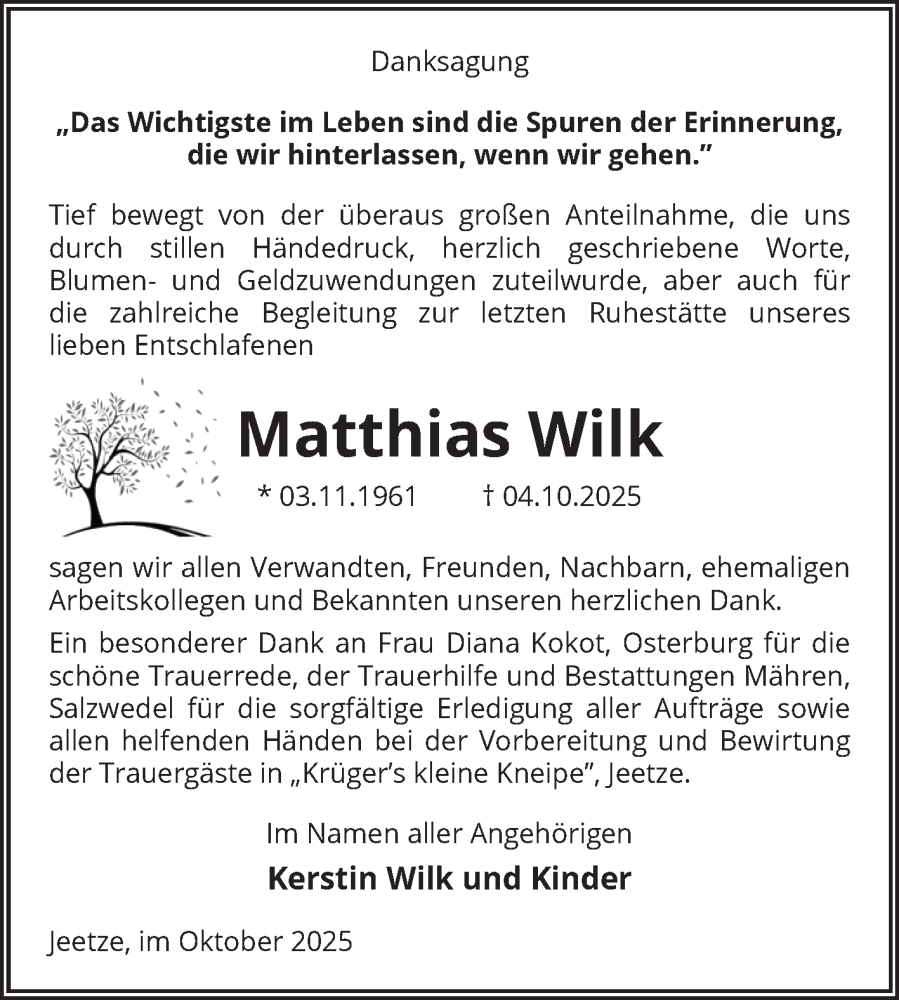 Hier finden Sie alle Traueranzeigen aus der Zeitung, die bisher für Matthias Wilk erschienen sind. Weitere Traueranzeigen, die in der Zeitung erscheinen, werden hier ebenfalls aufgelistet