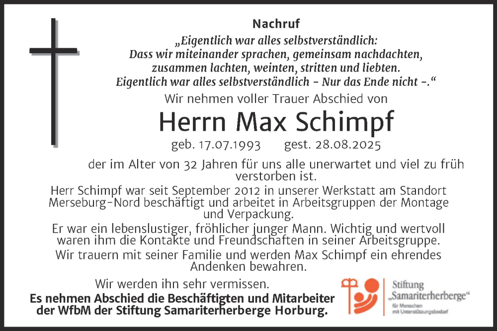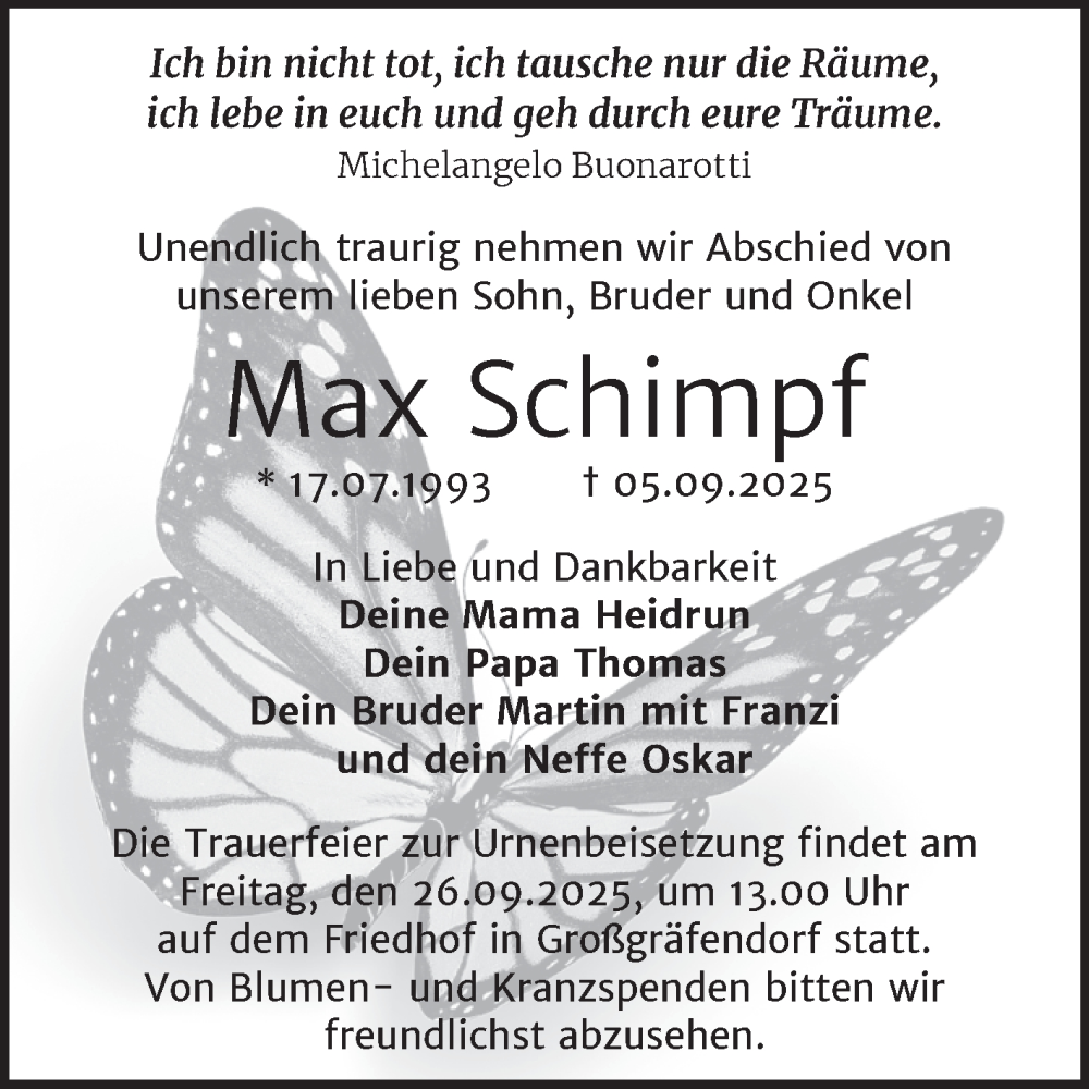 Hier finden Sie alle Traueranzeigen aus der Zeitung, die bisher für Max Schimpf erschienen sind. Weitere Traueranzeigen, die in der Zeitung erscheinen, werden hier ebenfalls aufgelistet