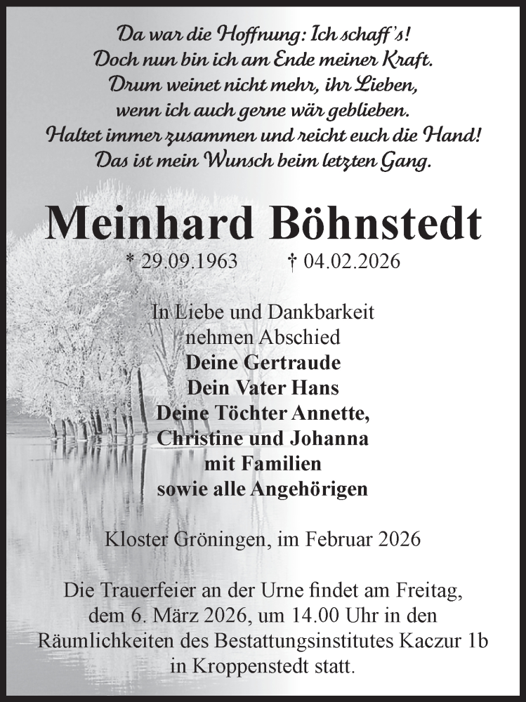 Hier finden Sie alle Traueranzeigen aus der Zeitung, die bisher für Meinhard Böhnstedt erschienen sind. Weitere Traueranzeigen, die in der Zeitung erscheinen, werden hier ebenfalls aufgelistet