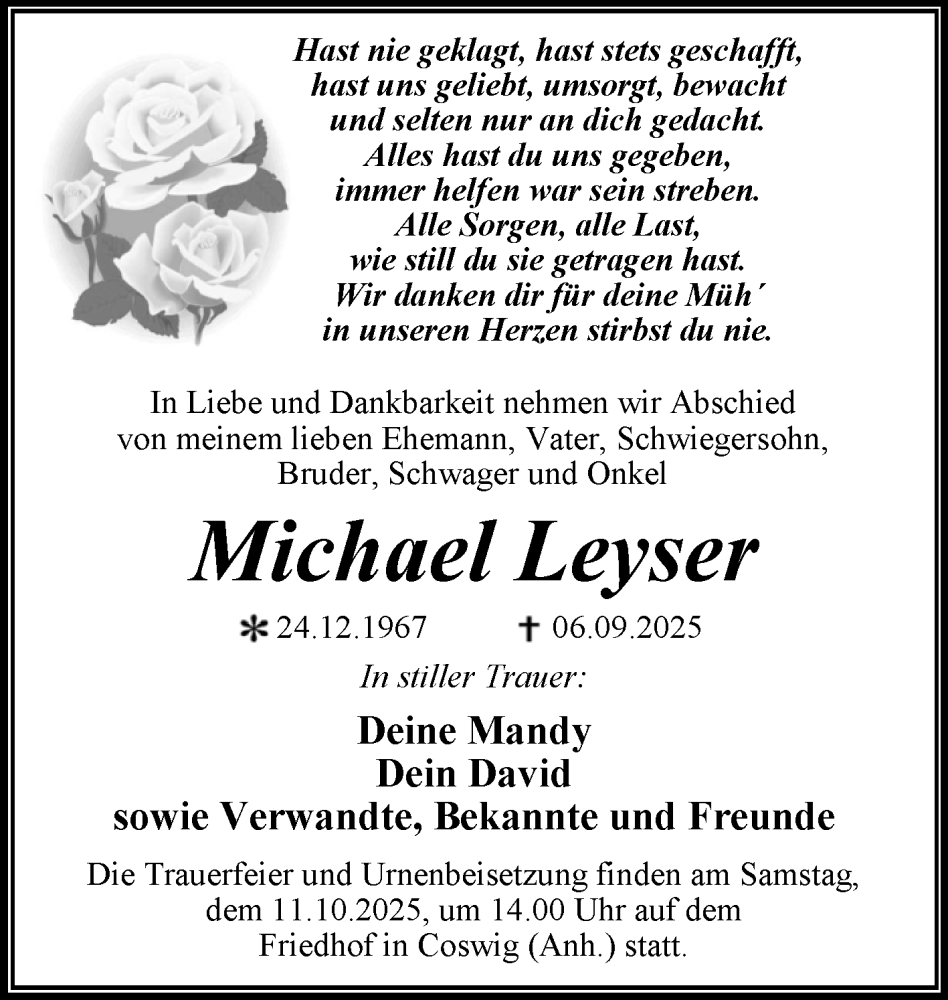 Hier finden Sie alle Traueranzeigen aus der Zeitung, die bisher für Michael Leyser erschienen sind. Weitere Traueranzeigen, die in der Zeitung erscheinen, werden hier ebenfalls aufgelistet