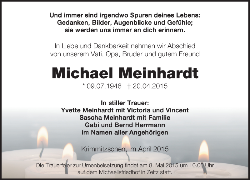 Hier finden Sie alle Traueranzeigen aus der Zeitung, die bisher für Michael Meinhardt erschienen sind. Weitere Traueranzeigen, die in der Zeitung erscheinen, werden hier ebenfalls aufgelistet