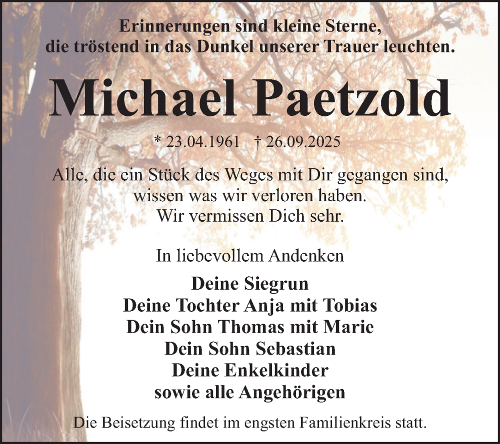 Hier finden Sie alle Traueranzeigen aus der Zeitung, die bisher für Michael Paetzold erschienen sind. Weitere Traueranzeigen, die in der Zeitung erscheinen, werden hier ebenfalls aufgelistet